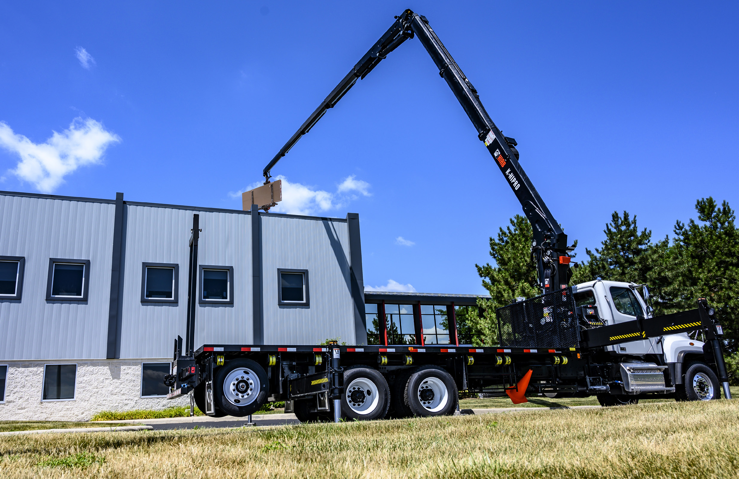 HIAB K-HiPro loader cranes are specifically designed for handling drywall materials, delivering excellent lifting capacity and fast load-cycles. The K-HiPro 515 is the largest in the K-cranes range with a vertical reach of 82’4″ and a lifting capacity of 296,400 lbs.