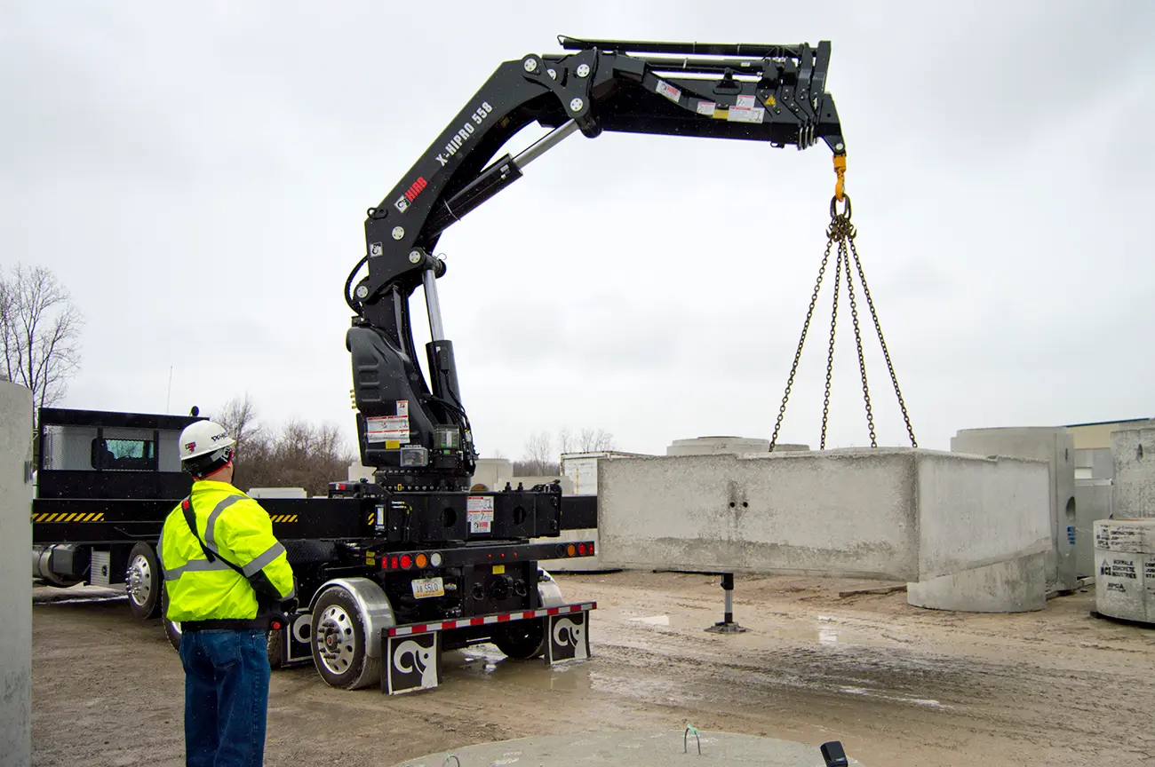 The HIAB X-HiPro 558 knuckle boom crane is specifically designed for heavy and bulky loads with a max lifting capacity of 368,500 ft-lbs.